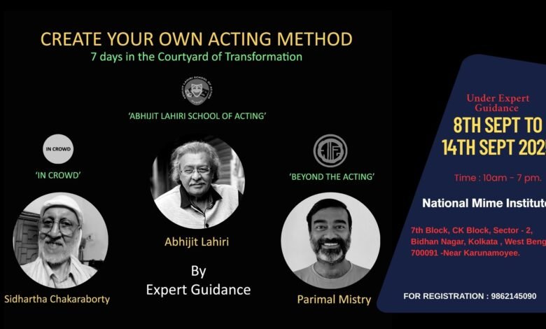 Kolkata is all set to witness an exciting and transformative journey in the world of theatre and performance. Renowned artists Abhijit Lahiri, Parimal Mistry, and Sidharth Chakraborty are coming together to host a 7-Day Intensive Acting Workshop titled “Create Your Own Acting Method.” The workshop will be held from 8th to 14th September 2025 at the Courtyard of Transformation, National Mime Institute, Salt Lake.