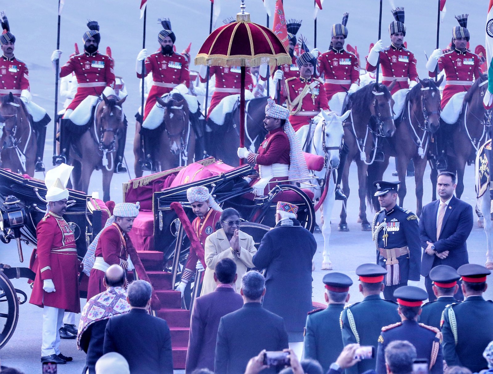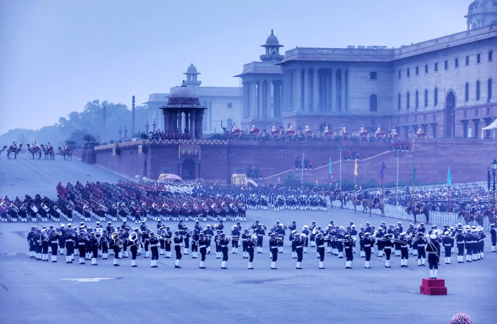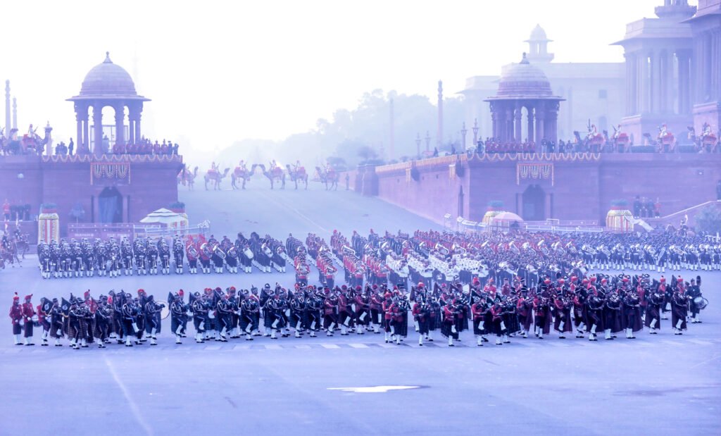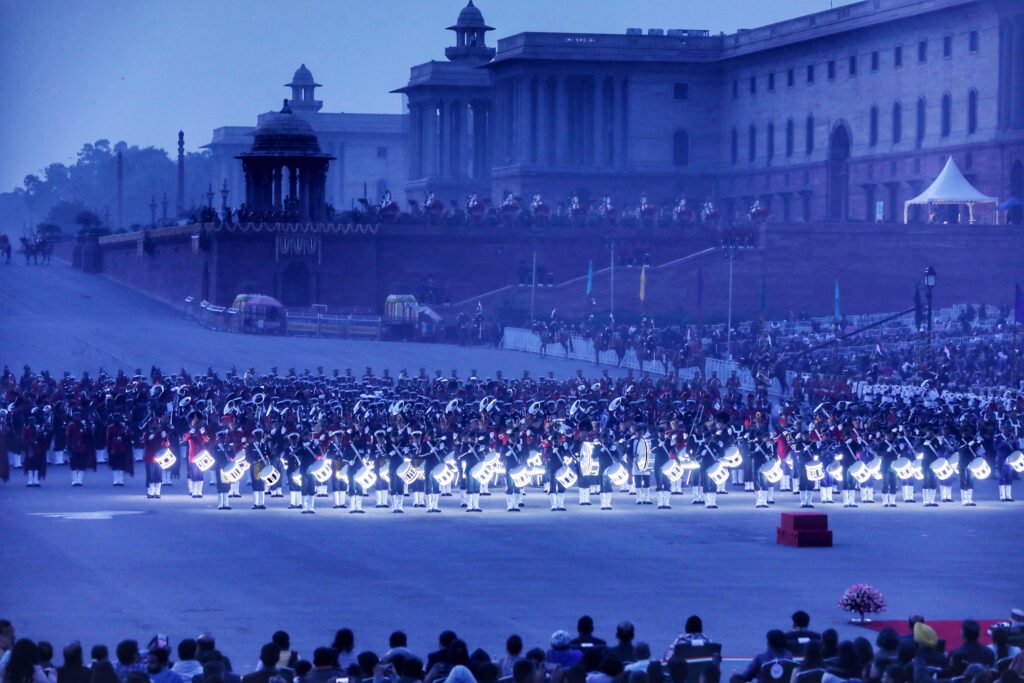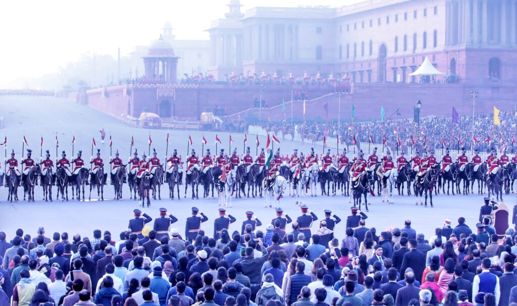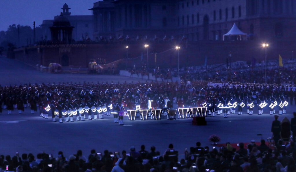 The Beating Retreat ceremony was held on January 29 at Vijay Chowk, New Delhi, in the presence of the President Draupadi Murmur, the Prime Minister Modi, the Defence Minister Rajnath Singh with other eminent ministers, and distinguished guests, marking the formal conclusion of the Republic Day 2026 celebrations. The event drew large crowds and senior defence officials, creating a dignified national atmosphere. Massed bands of the Indian Army, Navy, Air Force, Delhi Police, and Central Armed Police Forces presented synchronized performances of martial and patriotic tunes. The precision drill and musical coordination showcased the discipline and heritage of India’s armed forces. As dusk fell, the illumination of the North and South Block buildings enhanced the grandeur of the ceremony. The program concluded with traditional retreat calls and ceremonial protocol, symbolizing the close of the national festivities. The ceremony reflected unity, tradition, and pride, leaving a lasting impression on all attendees.
